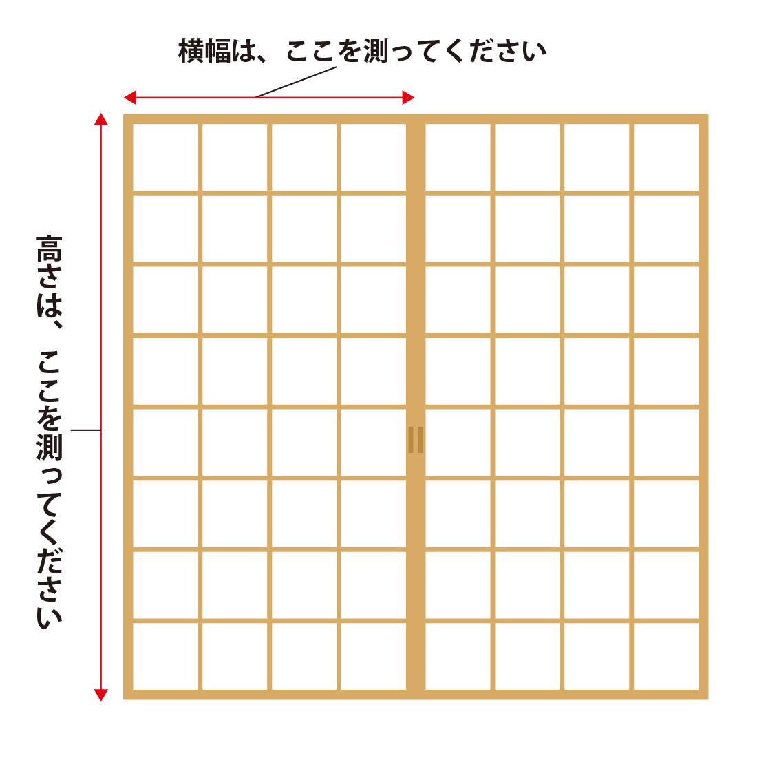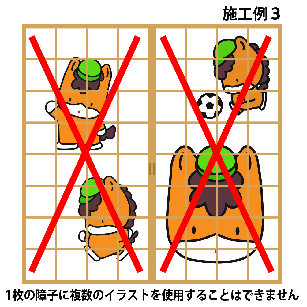 ご注文から納品設置までの流れをご説明いたします ぐんまちゃんイラストの使用について 令和3年度より、群馬県のイラスト使用方針が変わり、障子1枚に1デザインを使用することとなりました。 1枚の障子内に複数ぐんまちゃんを印刷することはできませんのでご注意ください。 障子2枚の時は2デザイン選択出来ます。(左右別々のぐんまちゃんを使用可能です) 【施工例1】 左側→Aデザイン+右側→Bデザイン(施工可能) 【施工例2】 左右共にAデザイン(施工可能) 【施工例3】 1枚の障子に複数点のデザイン(施工するこはできません) 群馬県に使用許可申請 お客様の希望にそって、当店が群馬県に対し使用許可申請を行います。 使用許可申請の結果が出ましたらメールで結果報告を致します。(結果報告まで2~3週間) 許認可が取得できましたら、正式のご契約とさせて頂きます。 許認可が取得出来ない場合もありますので、予めご了承ください。 (この場合、ここまでの料金は発生いたしませんのでご安心ください) 代金のお支払い 無事にぐんまちゃんイラストの使用許可がおりましたら、代金をお振込みいただきます。 入金のご確認ができしだい、障子に対する印刷作業に入ります。 ぐんまちゃんの下に許可番号(文字のサイズ約1cm程度)が印刷されます。 例 「群馬県のマスコットぐんまちゃん 許諾第2021-123456」 ぐんまちゃんオリジナル障子紙は、強化紙に印刷します。普通紙より約5倍の強度紙です。 ※ご注文を頂く地域によりましては、別途諸経費(交通費)等をご負担いただく場合がございます。 障子の引き取り 印刷が完了ましたら、お客様の障子をお引き取りさせていただき、弊社工房にて張替作業を行います。 障子の納品 施工が終わりましたら、お客様のご都合を伺ったうえ、納品させていただきます。 (施工期間は、引き取り後2~3日程度となります) 下のオレンジ枠内に掲載した「ぐんまちゃんデザイン一覧」をご覧いただき、使用したいデザインをじっくりご検討ください。使用したいイラストの名前(例:001-おっす!ぐんまちゃん)をお控えください。(このページの一番下にご用意したフォーム内の「使用許諾申請をしたい「ぐんまちゃん」をご記入ください」欄にご記入いただくため) お客様からの使用希望を受け、当店にてそのイラストの使用許諾を群馬県に対して申請させていただきます。 ※次の2つのイラストにつきましては、すでに使用許可申請が済んでおりますので、すぐにでもご利用いただけます。 群馬県のマスコットぐんまちゃん 許諾第29-070171号 (003)基本形ぐんまちゃん2 (098)蕎麦を食べるぐんまちゃん 群馬県が提供しているぐんまちゃんのデザイン一覧はこちらからご覧いただけます。 (新規ウインドが開きます) 障子寸法の測り方をご説明いたします 障子1枚の寸法は、イラストを参考にして測ってください。(イラストは、クリックすると拡大表示されます) 障子紙そのもののサイズではなく、枠まで含めた寸法を測ってください。 天袋・地袋の場合も、同じように枠まで含めたサイズを測ってください。 ガラス入り障子や腰板付き障子などの特殊障子は、寸法記載欄でご指示下さい。 下記フォームより、お客様からのご連絡をいただきましたら、あらためて当店からご連絡させていただきます。 その際、お値段等のご確認もさせていただきます。 どうぞよろしくお願いいたします。 お名前(必須) お名前のふりがな(必須) ご住所(必須) 電話番号(必須) 当店からお電話をさせていただく場合、ご希望の時間帯があればご記入ください。(任意) メールアドレス(必須) 題名(任意) ここに下記を参考に障子の寸法を記載してください (必須) (張り替えたい障子の寸法と枚数の記載例)幅90cm×高さ180cm(2枚) 使用許諾申請をしたい「ぐんまちゃん」をご記入ください 2つ以上ご使用になる場合は、改行してご記入ください。 (記入例)001-おっす!ぐんまちゃん
